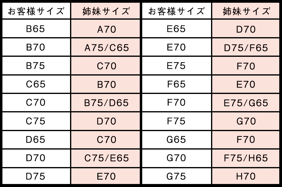 ●姉妹サイズとは、普段お使いただいているサイズに最も近く、代用が可能な別のサイズを示します。